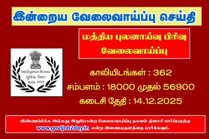 மத்திய புலனாய்வு பிரிவில் காலியாக உள்ள 362 Multi Tasking Staff (General) Posts பணியிடங்களை நிரப்புவதற்காக வேலைவாய்ப்பு அறிவிப்பு வெளியிடப்பட்டுள்ளது. விருப்பமும், தகுதியும் உள்ளவர்கள் கீழ்கண்ட முறையில் விண்ணப்பித்து பயன்பெறுங்கள்.