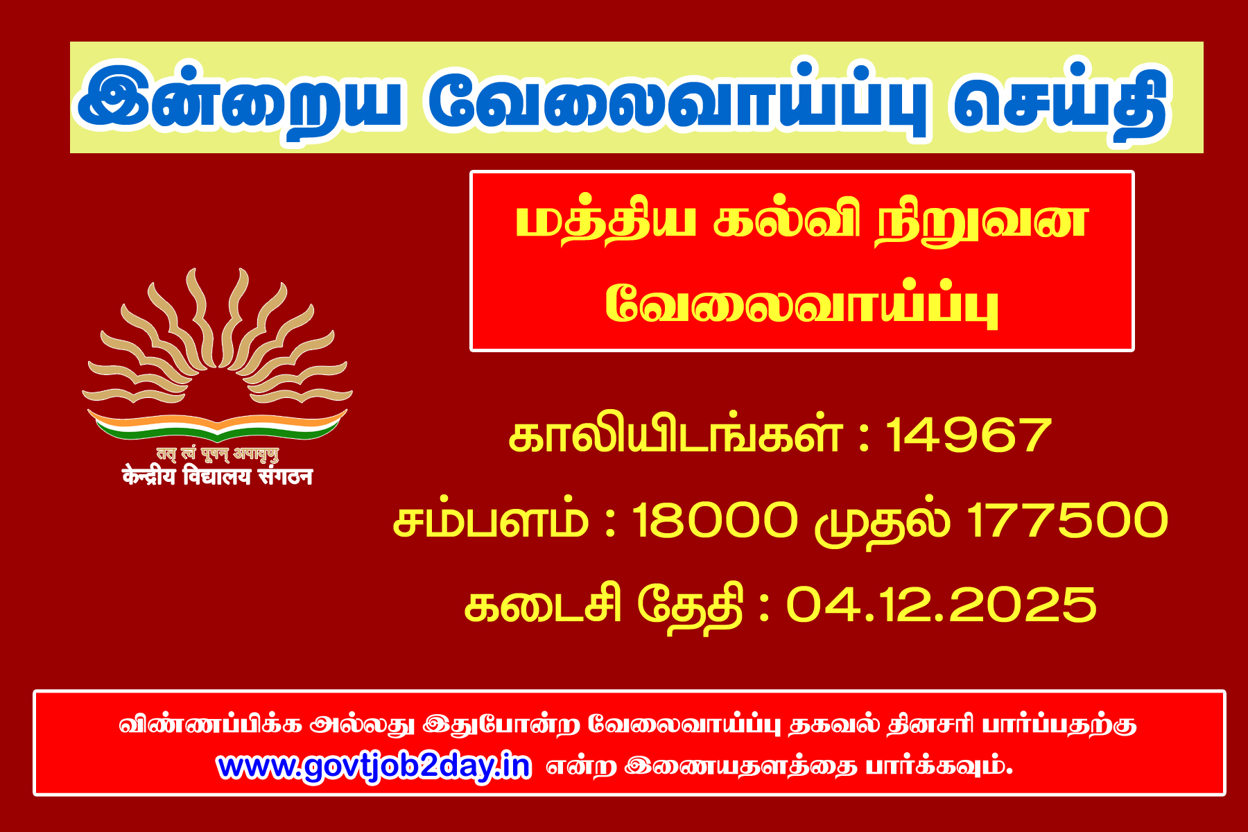 மத்திய அரசின் கீழ் இயங்கக்கூடிய Kendriya Vidyalaya Sangathan-ல் காலியாக உள்ள 14967 (Teaching & Non Teaching Posts) பணியிடங்களை நிரப்புவதற்காக வேலைவாய்ப்பு அறிவிப்பு வெளியிடப்பட்டுள்ளது. விருப்பமும், தகுதியும் உள்ளவர்கள் கீழ்கண்ட முறையில் விண்ணப்பித்து பயன்பெறுங்கள்.