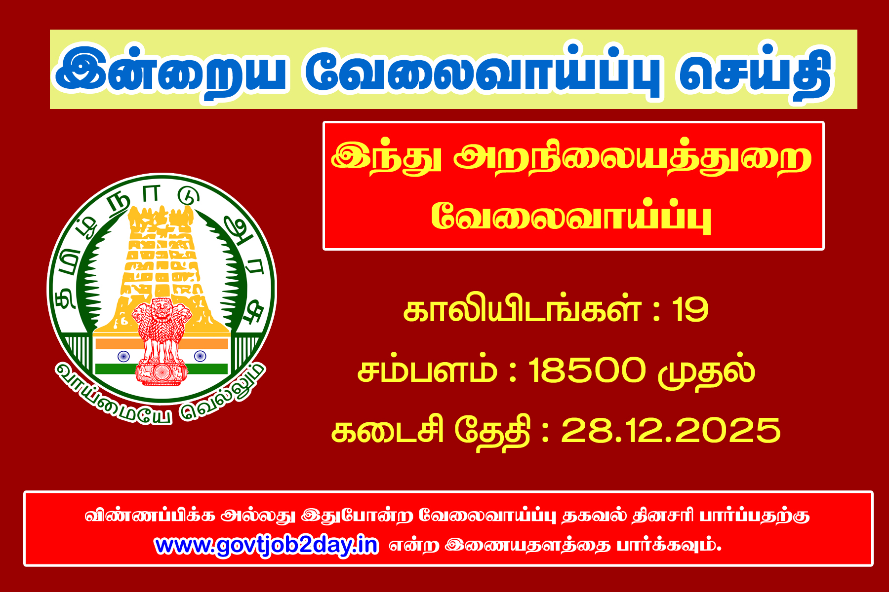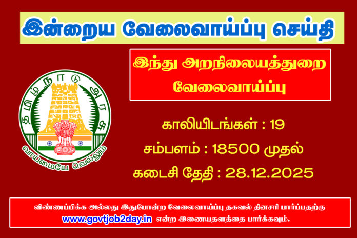 பதவியின் பெயர் – Assistant Engineer (Civil), Junior Assistant, Ticket Seller, Tamil Pulavar, Assistant Electrician, Para, Gurukkal / Archakar, Kavalar, Assistant Paricharakar Posts மொத்தம் 19 காலியிடங்கள்.