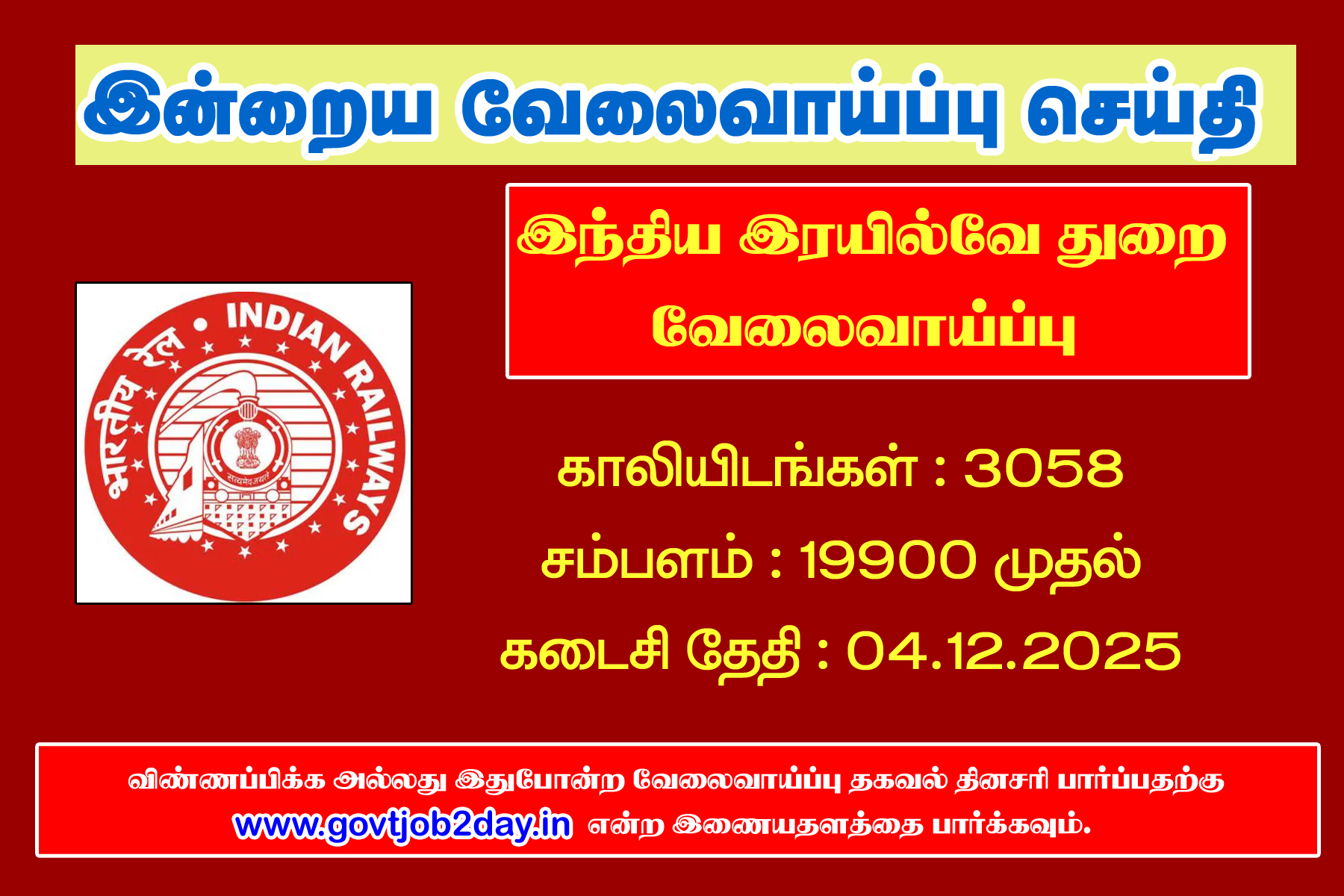 மத்திய அரசின் கீழ் இயங்கும் இந்திய இரயில்வே துறையில் காலியாக உள்ள 3058 Posts பணியிடங்களை நிரப்புவதற்காக வேலைவாய்ப்பு அறிவிப்பு வெளியிடப்பட்டுள்ளது. விருப்பமும், தகுதியும் உள்ளவர்கள் கீழ்கண்ட முறையில் விண்ணப்பித்து பயன்பெறுங்கள்.