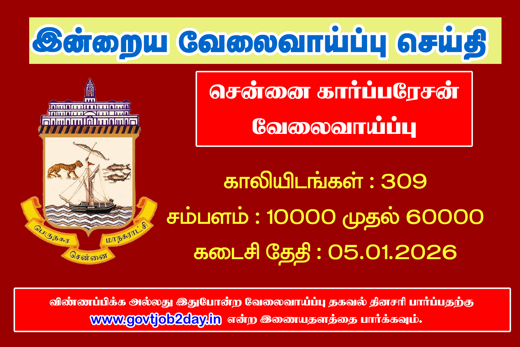 தமிழக அரசின் கீழ் இயங்கும் சென்னை கார்ப்பரேசனில் காலியாக உள்ள 309 பல்வேறு பணியிடங்களை நிரப்புவதற்காக வேலைவாய்ப்பு அறிவிப்பு வெளியிடப்பட்டுள்ளது. விருப்பமும், தகுதியும் உள்ளவர்கள் கீழ்கண்ட முறையில் விண்ணப்பித்து பயன்பெறுங்கள்.