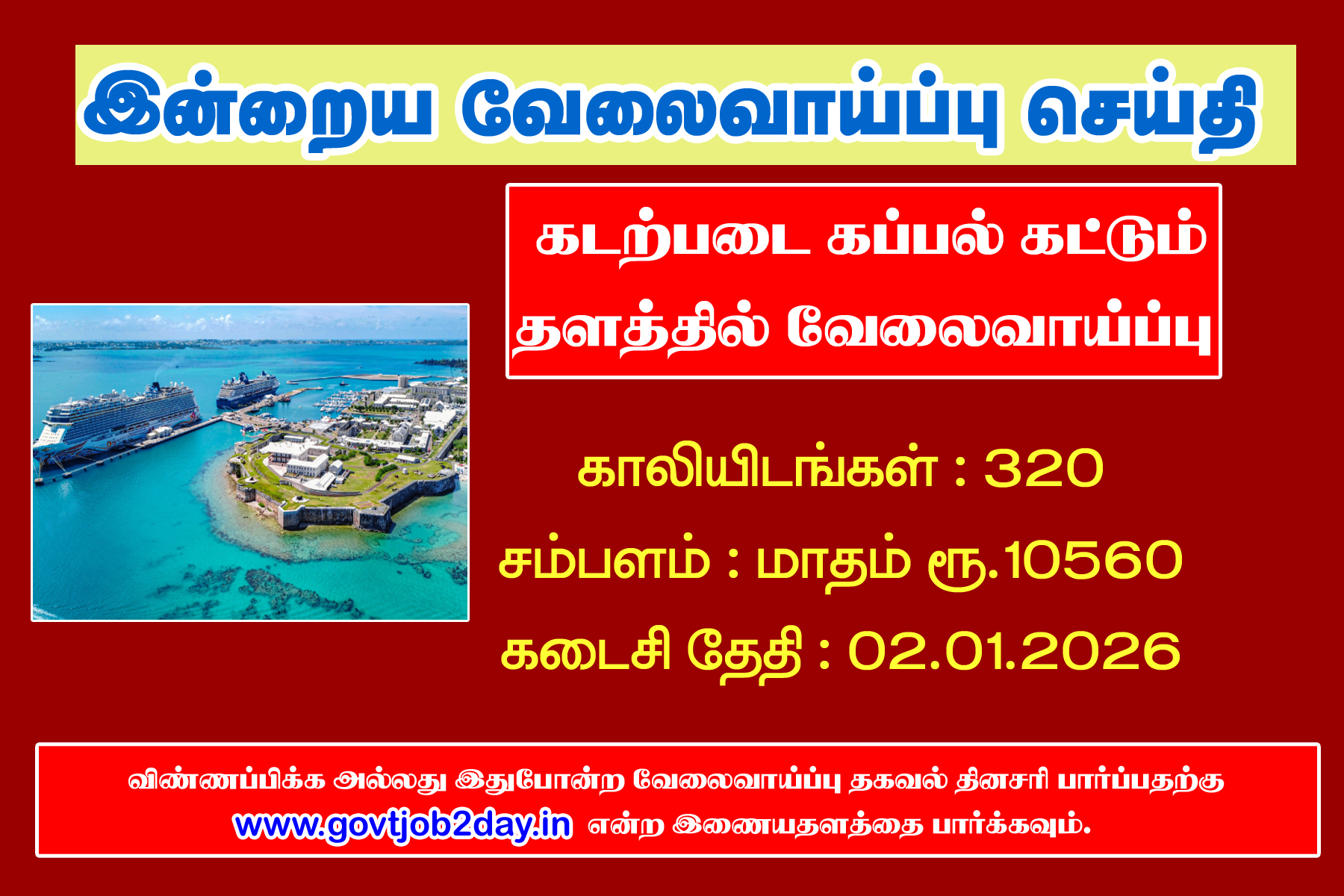 மத்திய அரசின் கடற்கடை கப்பல் கட்டும் தளத்தில் 320 Apprentice பணியிடங்களை நிரப்புவதற்காக வேலைவாய்ப்பு அறிவிப்பு வெளியிடப்பட்டுள்ளது. விருப்பமும், தகுதியும் உள்ளவர்கள் கீழ்கண்ட முறையில் விண்ணப்பித்து பயன்பெறுங்கள்.