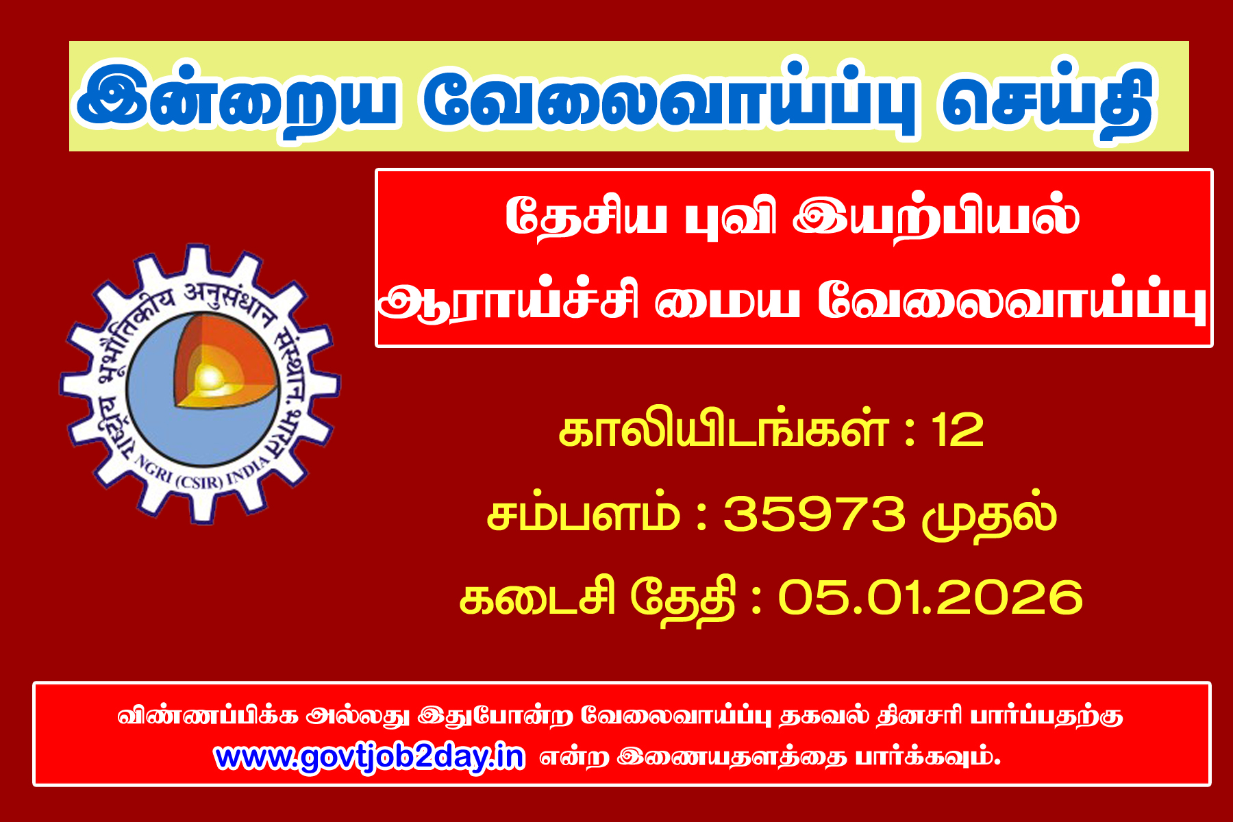 மத்திய அரசின் தேசிய புவி இயற்பியல் ஆராய்ச்சி நிறுவனத்தில் காலியாக உள்ள 12 Multi Tasking Staff’s Posts பணியிடங்களை நிரப்புவதற்காக வேலைவாய்ப்பு அறிவிப்பு வெளியிடப்பட்டுள்ளது. விருப்பமும், தகுதியும் உள்ளவர்கள் கீழ்கண்ட முறையில் விண்ணப்பித்து பயன்பெறுங்கள்.