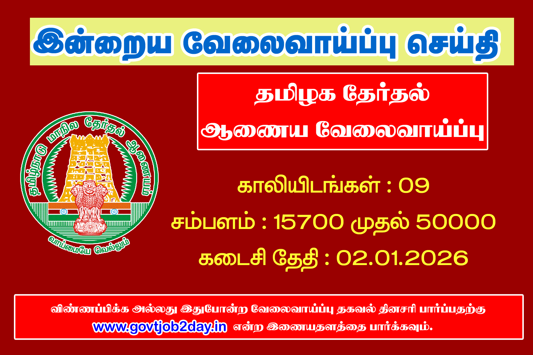 தமிழ்நாடு மாநில தேர்தல் ஆணையத்தில் காலியாக உள்ள 09 பணியிடங்களை நிரப்புவதற்காக வேலைவாய்ப்பு அறிவிப்பு வெளியிடப்பட்டுள்ளது. விருப்பமும், தகுதியும் உள்ளவர்கள் கீழ்கண்ட முறையில் விண்ணப்பித்து பயன்பெறுங்கள்.